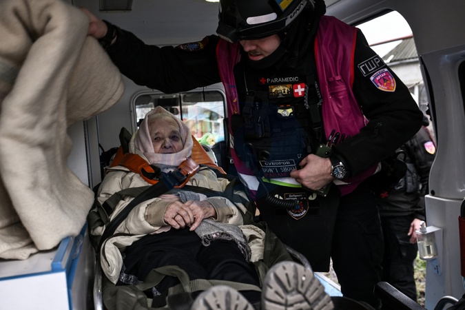 A paramedic covers an elderly woman with a blanket in an ambulance during an evacuation requested by her relatives, Kushuhum village, Zaporizhzhia region, Ukraine, January 8, 2026. The mandatory evacuation of residents from 33 settlements in five communities of the Zaporizhzhia region is underway as the security situation remains difficult., Credit:Dmytro Smolienko / Avalon