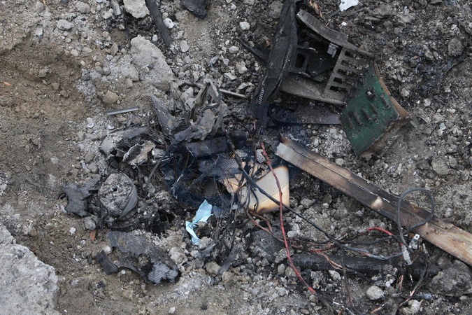 Fragments of a Russian drone lie on the ground at a garage cooperative in Dnipro, Ukraine, on January 10, 2026., Credit:Mykola Miakshykov / Avalon