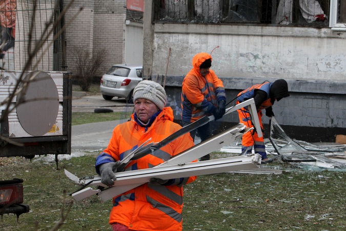 Municipal workers remove broken window frames and glass shards outside an apartment block damaged by a Russian drone strike in Dnipro, Ukraine, on January 10, 2026., Credit:Mykola Miakshykov / Avalon