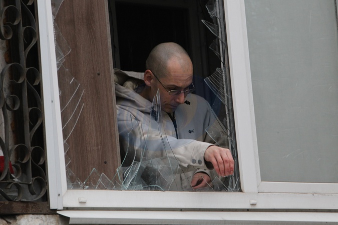 A man removes glass shards at a window smashed by the shock wave from a Russian drone strike, Dnipro, Ukraine, on January 10, 2026., Credit:Mykola Miakshykov / Avalon