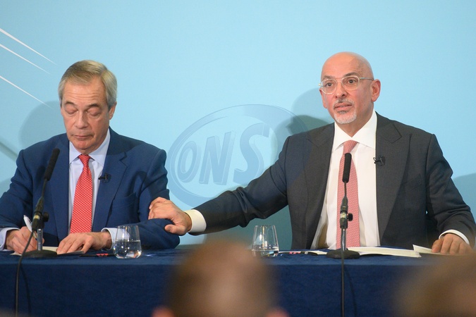 Reform UK Leader Nigel Farage and New recruit Nadhim Zahawi at a Reform UK Press Conference at IoD in London, England, UK on Monday 12 January, 2026 ., Credit:Justin Ng / Avalon