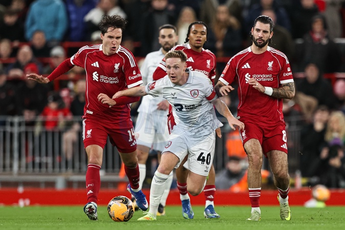 Davis Keillor-Dunn of Barnsley breaks with the ball during the Emirates FA Cup Third Round match Liverpool vs Barnsley at Anfield, Liverpool, United Kingdom, 12th January 2026, Credit:Ae Cosgrove/News Images / Avalon