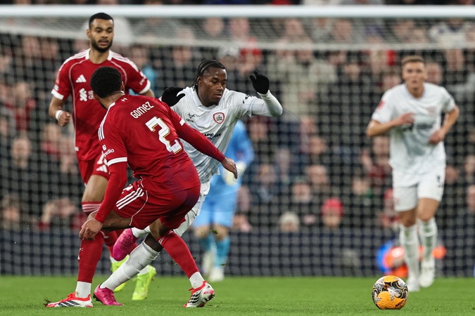 Reyes Cleary of Barnsley is fouled by Joe Gomez of Liverpool during the Emirates FA Cup Third Round match Liverpool vs Barnsley at Anfield, Liverpool, United Kingdom, 12th January 2026, Credit:Ae Cosgrove/News Images / Avalon