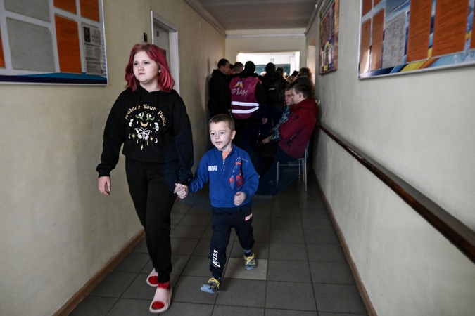 A girl holds a boy by the hand in a corridor of a transit center for evacuees that began operating on November 25, 2025, Zaporizhzhia, Ukraine, on January 8, 2026. The facility functions as a one-stop shop, where evacuees can process documents, open bank accounts, and receive financial, humanitarian, psychological, and legal assistance. Evacuees are able to stay at the center for three to seven days before being relocated to temporary housing in the regional center or to safer parts of Ukraine. The center has already assisted around 1,500 people, Credit:Dmytro Smolienko / Avalon