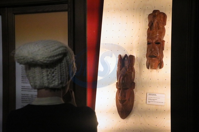 A visitor looks at mask-shaped decor displayed at the exhibition "Africa: Direct”, the first museum project of the period of Ukrainian independence dedicated to the historical and cultural heritage of Africa, during an Open Day at the Khanenko Museum, Kyiv, Ukraine, on January 7, 2026, Credit:Yuliia Ovsiannikova / Avalon