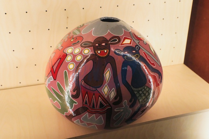 A painted calabash by Tanzanian artist Georg Lilanga is displayed at the exhibition "Africa: Direct”, the first museum project of the period of Ukrainian independence dedicated to the historical and cultural heritage of Africa, during an Open Day at the Khanenko Museum, Kyiv, Ukraine, on January 7, 2026, Credit:Yuliia Ovsiannikova / Avalon