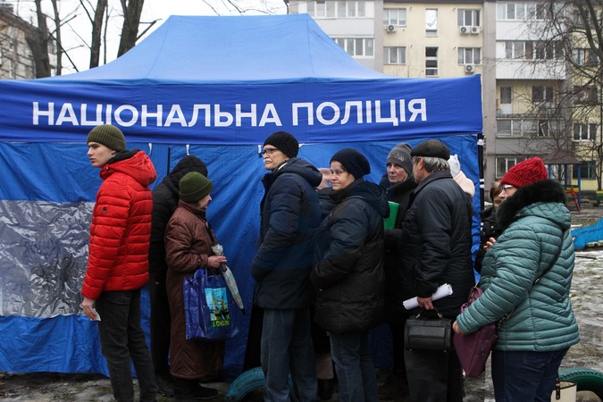 Residents of a multi-storey residential building damaged as a result of a Russian drone attack line up at a National Police of Ukraine tent in Dnipro, Ukraine, on January 7, 2026, Credit:Mykola Miakshykov / Avalon