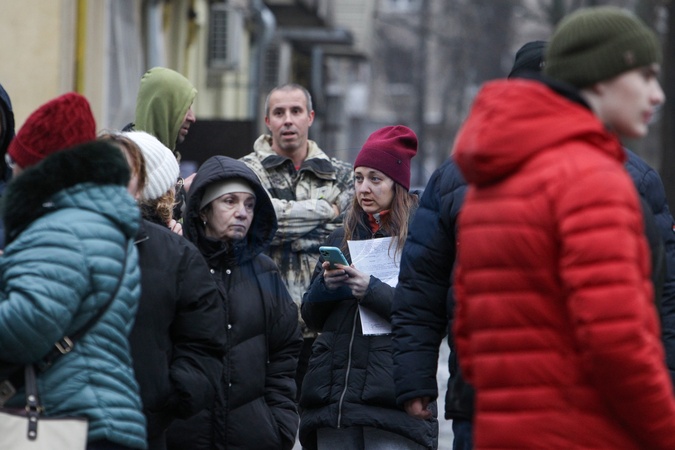 Residents of a multi-storey residential building damaged as a result of a Russian drone attack line up at a National Police of Ukraine tent in Dnipro, Ukraine, on January 7, 2026, Credit:Mykola Miakshykov / Avalon
