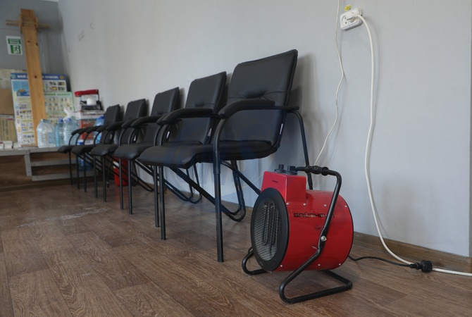 An electric heater stands by rest areas for visitors at a Point of Invincibility set up in an administrative building at 11-A Kioto Street in the Desnianskyi district of Kyiv, Ukraine, on January 12, 2026, Credit:Yuliia Ovsiannikova / Avalon
