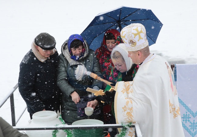 Rector of the Nativity of the Blessed Virgin Mary Church Archpriest Dmytro Koshka (R) participates in the water blessing ceremony during the Epiphany celebration, Borodianka, Kyiv region, Ukraine, on January 6, 2026, Credit:Volodymyr Tarasov / Avalon
