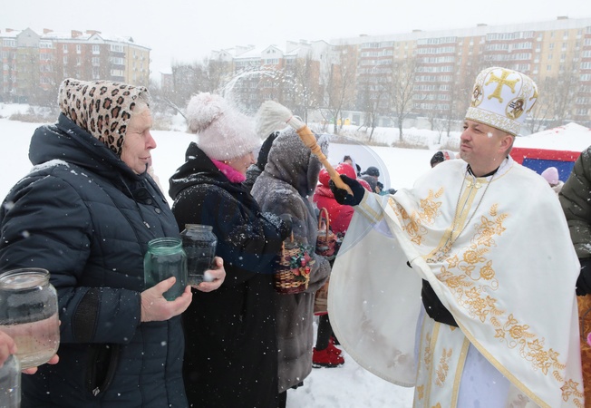 Rector of the Nativity of the Blessed Virgin Mary Church Archpriest Dmytro Koshka (R) sprinkles holy water on worshippers during the Epiphany celebration, Borodianka, Kyiv region, Ukraine, on January 6, 2026, Credit:Volodymyr Tarasov / Avalon
