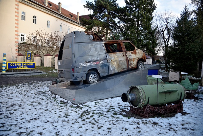A Tochka-U missile launch engine, a destroyed ambulance hit by a Russian drone near Rodynske in Donetsk region in January 2025, and a border marker from Zmiinyi Island are displayed at Uzhhorod Castle, Uzhhorod, Ukraine, on January 4, 2026. The marker was acquired at a 2024 charity auction organized by Ukrainska Pravda to support Defence Intelligence special forces involved in the liberation of Zmiinyi Island, Credit:Yulii Zozulia / Avalon