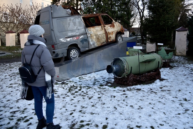 A girl looks at a Tochka-U missile launch engine displayed near an ambulance destroyed by a Russian drone attack near Rodynske, Donetsk region, in January 2025 at Uzhhorod Castle, Uzhhorod, Ukraine, on January 4, 2026. The border marker from Zmiinyi Island was bought at a 2024 charity auction organized by Ukrainska Pravda to support Defence Intelligence special forces involved in the liberation of Zmiinyi Island, Credit:Yulii Zozulia / Avalon