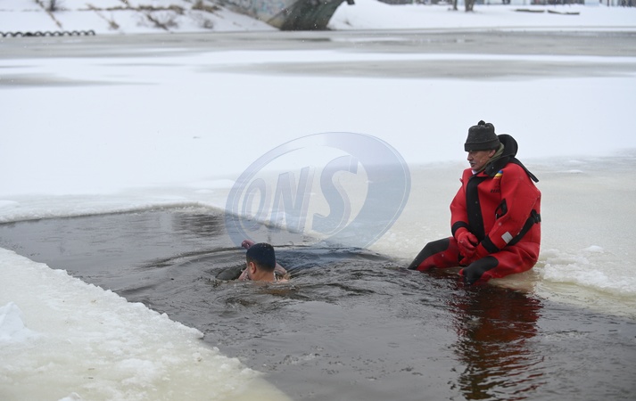 A rescuer watches a man plunge into an ice hole during the Epiphany celebration at Hydropark in Kyiv, Ukraine, on January 6, 2026, Credit:Yevhen Kotenko / Avalon