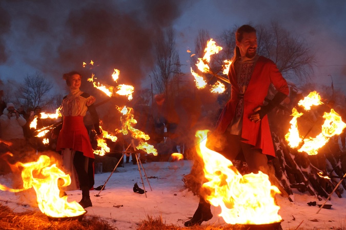 People take part in a fire show during the Epiphany celebration by Yordanske Lake in the Obolonskyi district of Kyiv, Ukraine, on January 6, 2026, Credit:Pavlo Bahmut / Avalon
