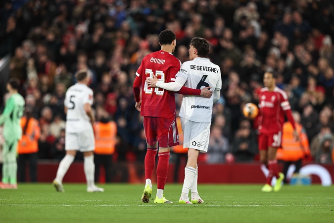 Hugo Ekitike of Liverpool embraces Mael de Gevigney of Barnsley after the Emirates FA Cup Third Round match Liverpool vs Barnsley at Anfield, Liverpool, United Kingdom, 12th January 2026, Credit:Ae Cosgrove/News Images / Avalon