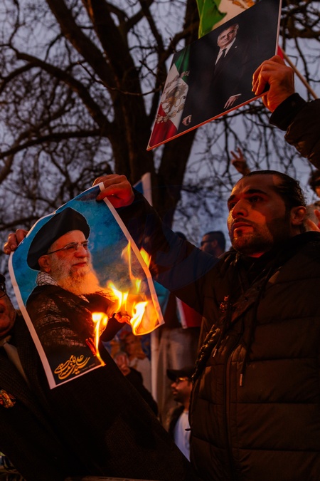Iranian Embassy, London, UK. 12th January 2026.Protester holds a burning image of the Ayatollah, Ali Khamenei in one hand and the exiled Crown Prince of Iran, Reza Pahlavi in the other.Activists and members of the Iranian community in London have been gathering in front of the Iranian Embassy in support of the protests in Iran and against the Islamic Republic and Ayatollah., Credit:Photo by Amanda Rose / Avalon