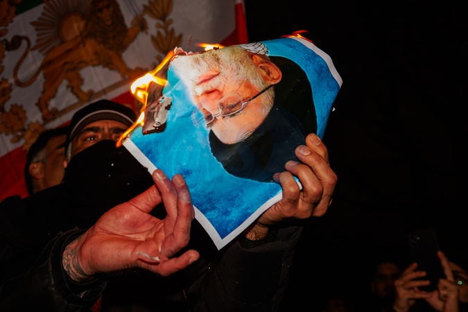 Iranian Embassy, London, UK. 12th January 2026.A protester holds a burning image of the Ayatollah, Ali Khamenei.Activists and members of the Iranian community in London have been gathering in front of the Iranian Embassy in support of the protests in Iran and against the Islamic Republic and Ayatollah., Credit:Photo by Amanda Rose / Avalon