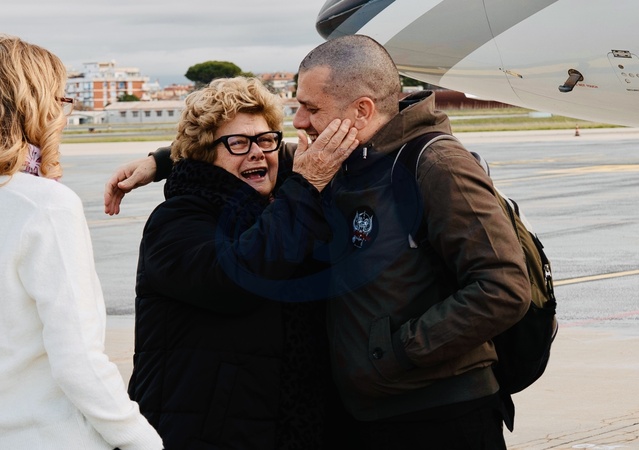January 13, 2026, Ciampino. Trentini and Burlò arrive in Italy. Pictured is Alberto Trentini with his mother after landing., Credit:Press Office / Avalon