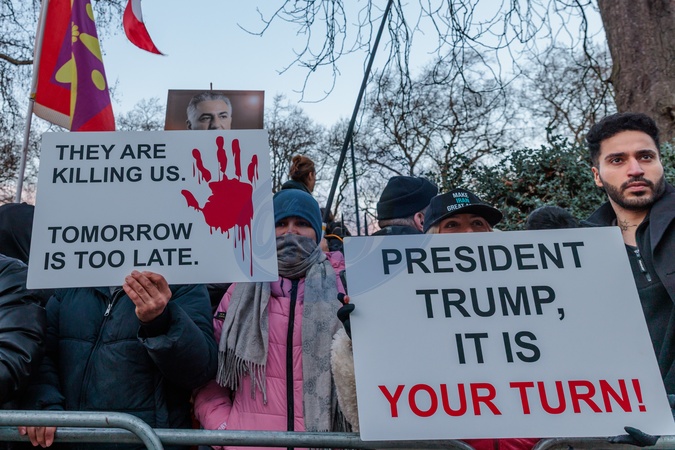 Iranian Embassy, London, UK. 12th January 2026.Activists and members of the Iranian community hold placards in front of the Iranian Embassy in London calling for US President Trumps support as reports of mass killings of protesters filters through, despite the communication blackout in Iran.The Government cut internet services and phone lines in Iran on the 8th Jan, in an attempt to hide the extent of the protests and proof of mass killings reaching the wider world., Credit:Photo by Amanda Rose / Avalon