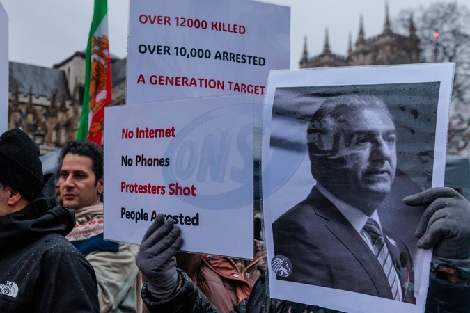 Parliament Square, London, UK. 13th January 2026.Activists and members of the Iranian community in London held their 63rd weekly protest opposite the Houses of Parliament, demanding that the UK government place the Islamic Revolutionary Guard Corps (IRGC) on Britain's terrorist list with chants including 'UK Government, stop supporting terrorists', Credit:Photo by Amanda Rose / Avalon