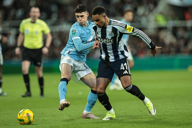 Jacob Ramsey of Newcastle United holds off Phil Foden of Manchester City during the Carabao Cup Semi-finals First Leg Newcastle United vs Manchester City at St. James's Park, Newcastle, United Kingdom, 13th January 2026, Credit:Mark Cosgrove/News Images / Avalon