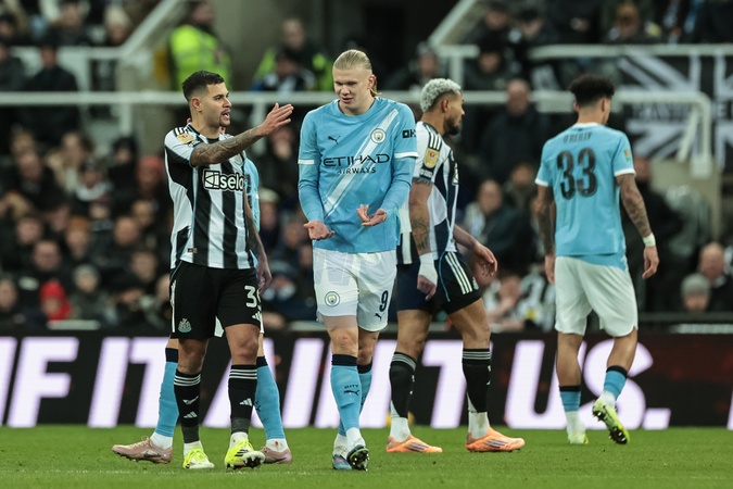 Bruno Guimaraes of Newcastle Untied and Erling Haaland of Manchester City interacting after both sides receive yellow cards during the Carabao Cup Semi-finals First Leg Newcastle United vs Manchester City at St. James's Park, Newcastle, United Kingdom, 13th January 2026, Credit:Mark Cosgrove/News Images / Avalon