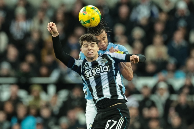 Nathan Ake of Manchester City jumps up to win the high ball from Lewis Miley of Newcastle Untied during the Carabao Cup Semi-finals First Leg Newcastle United vs Manchester City at St. James's Park, Newcastle, United Kingdom, 13th January 2026, Credit:Mark Cosgrove/News Images / Avalon