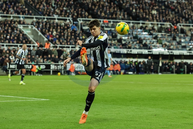 Lewis Miley of Newcastle Untied clears the ball up field during the Carabao Cup Semi-finals First Leg Newcastle United vs Manchester City at St. James's Park, Newcastle, United Kingdom, 13th January 2026, Credit:Mark Cosgrove/News Images / Avalon