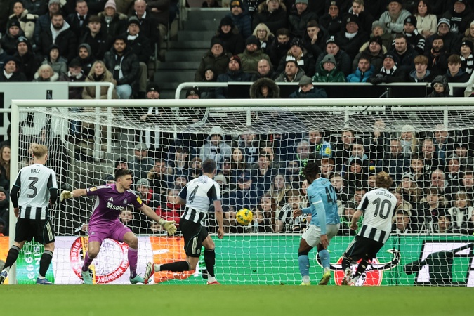 Antonie Semenyo of Manchester City scores to make it 0-1 during the Carabao Cup Semi-finals First Leg Newcastle United vs Manchester City at St. James's Park, Newcastle, United Kingdom, 13th January 2026, Credit:Mark Cosgrove/News Images / Avalon