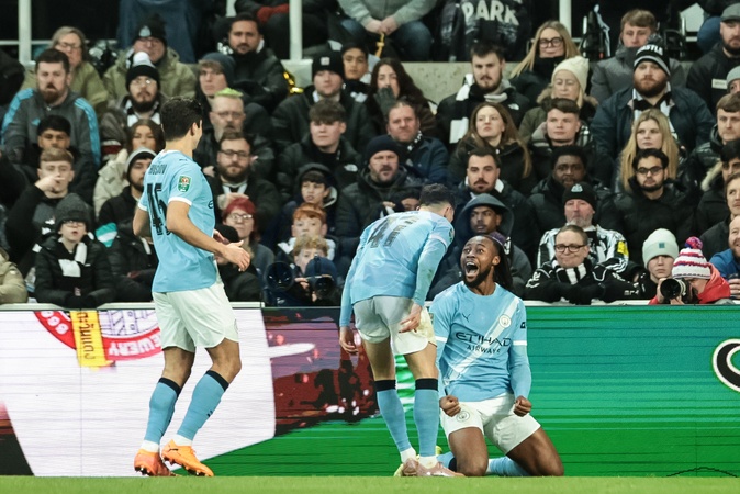 Antonie Semenyo of Manchester City celebrates his goal to make it 0-1 during the Carabao Cup Semi-finals First Leg Newcastle United vs Manchester City at St. James's Park, Newcastle, United Kingdom, 13th January 2026, Credit:Mark Cosgrove/News Images / Avalon