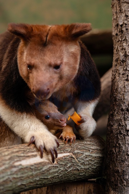 Tree kangaroo joey emerges from his mum's pouch at Chester Zoo