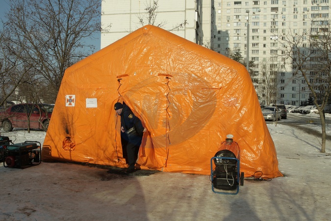 Generators power a heating tent set up outside apartment blocks in the Desnianskyi district of Kyiv, Ukraine, on January 12, 2026. As work to restore a stable power supply after another Russian strike is ongoing in the Ukrainian capital, rescuers provide residents of the city's left bank districts with a place to warm up, charge devices and, if needed, receive psychological support at mobile Points of Invincibility operating in the tents of the State Emergency Service. Each tent is equipped with heat guns, generators and places for visitors where they can rest., Credit:Hennadii Minchenko / Avalon
