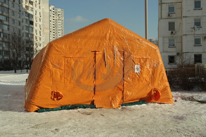 A heating tent is outside apartment blocks in the Desnianskyi district of Kyiv, Ukraine, on January 12, 2026. As work to restore a stable power supply after another Russian strike is ongoing in the Ukrainian capital, rescuers provide residents of the city's left bank districts with a place to warm up, charge devices and, if needed, receive psychological support at mobile Points of Invincibility operating in the tents of the State Emergency Service. Each tent is equipped with heat guns, generators and places for visitors where they can rest., Credit:Hennadii Minchenko / Avalon
