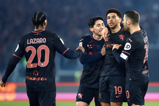 Stadio Olimpico, round of 16 of the Coppa Italia 2025-26 Roma-Turin, in the photo Che Adams celebrates with his teammates after the 0-1 goal . Rome, Italy 13 January 2026, Credit:Federico Proietti Sync / Avalon
