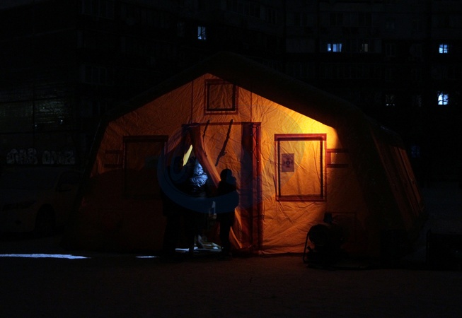 A heating tent set up in the Desnianskyi district of Kyiv, Ukraine, on January 13, 2026. Following missile and drone attacks, the energy situation in the capital has deteriorated, prompting a full transition to emergency power outages. Some buildings remain without heat, while heating tents and Points of Invincibility have been set up, Credit:Hennadii Minchenko / Avalon