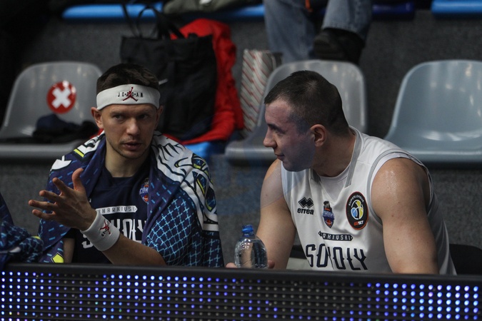 Forward Maksym Nikitin (R) of BC Kharkivski Sokoly (Kharkiv Falcons) talks to his teammate during the 2025/2026 Ukrainian Basketball SuperLeague Round 9 against BC Rivne-OSHVSM at the Shynnyk Culture and Sports Complex, Dnipro, Ukraine, January 10, 2026., Credit:Mykola Miakshykov / Avalon
