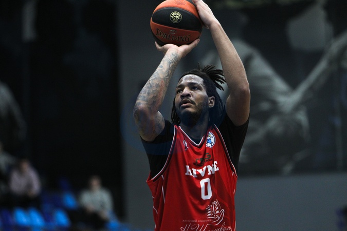 Power forward Jalen Dupree of BC Rivne-OSHVSM makes a free throw during the 2025/2026 Ukrainian Basketball SuperLeague Round 9 match against BC Kharkivski Sokoly (Kharkiv Falcons) at the Shynnyk Culture and Sports Complex, Dnipro, Ukraine, January 10, 2026., Credit:Mykola Miakshykov / Avalon
