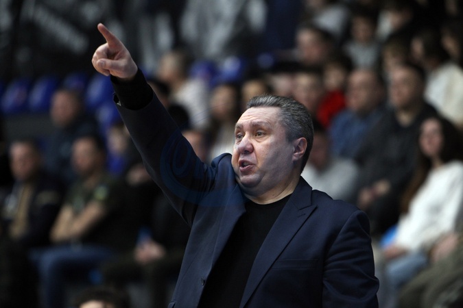 Head coach of BC Kharkivski Sokoly (Kharkiv Falcons) Valerii Plekhanov gestures on the sideline during the 2025/2026 Ukrainian Basketball SuperLeague Round 9 match against BC Rivne-OSHVSM at the Shynnyk Culture and Sports Complex, Dnipro, Ukraine, January 10, 2026., Credit:Mykola Miakshykov / Avalon