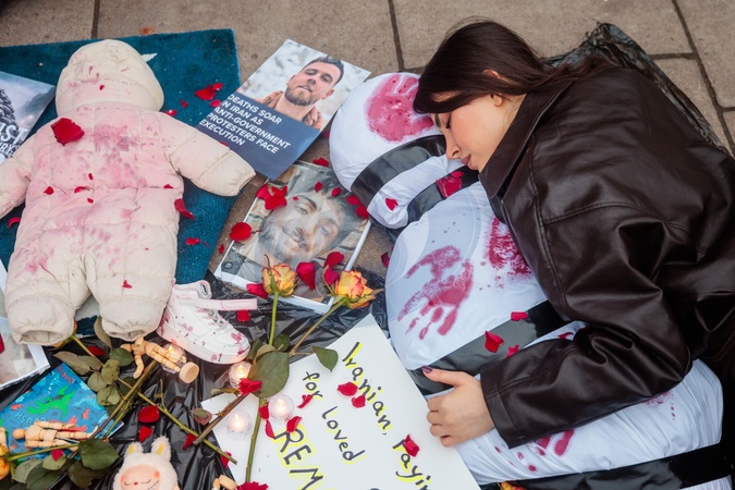 Iranian Embassy, London, UK. 14th January 2026.A protester embraces a replica of a body wrapped in a bloody shroud, representing the estimated tens of thousands of loved ones killed by the Islamic Regime since the Iranian Government cut internet services and phone lines on the 8th January. The blackout is believed to be an attempt to hide the extent of the protests and proof of mass killings reaching the wider world., Credit:Photo by Amanda Rose / Avalon