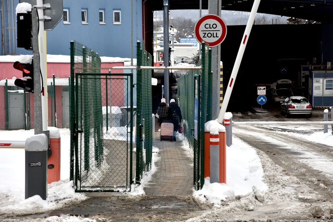 Women are at the Uzhhorod-Vysne Nemecke crossing point on the Ukraine-Slovakia border, Zakarpattia region, Ukraine, January 14, 2026. The pedestrian and cyclist crossing was inaugurated following the entry into force of the Protocol between the governments of Ukraine and the Slovak Republic, signed in October 2025. The agreement aims to ease checkpoint congestion and improve citizens' mobility., Credit:Yulii Zozulia / Avalon