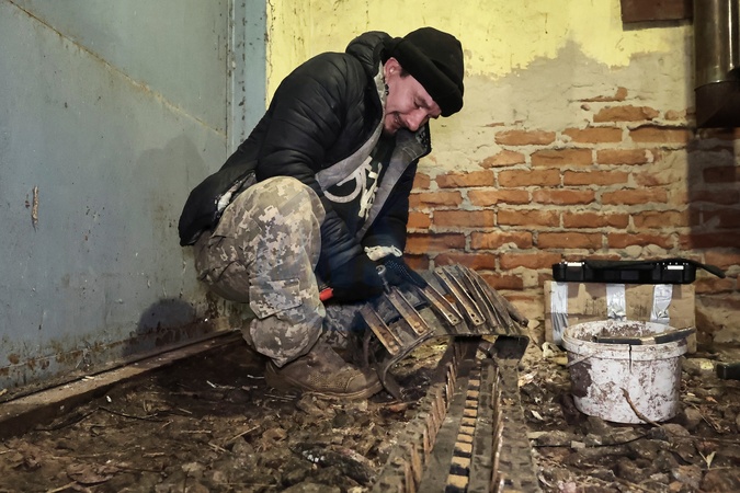 A soldier from the repair and restoration battalion of the Otaman Kost Hordiienko Motorised Brigade of the Ukrainian Armed Forces works with continuous tracks as he prepares an unmanned ground vehicle (UGV) for use in the Vovchansk direction, Ukraine, January 8, 2026., Credit:Viacheslav Madiievskyi / Avalon