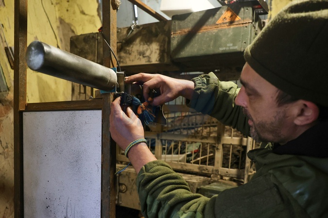 Soldier Serhii (call sign "Sienia") from the repair and restoration battalion of the Otaman Kost Hordiienko Motorised Brigade of the Ukrainian Armed Forces attaches a motanka doll to an unmanned ground vehicle (UGV) being prepared for use in the Vovchansk direction, Ukraine, January 8, 2026., Credit:Viacheslav Madiievskyi / Avalon