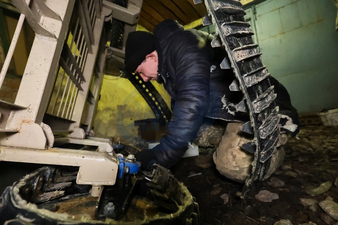 A soldier from the repair and restoration battalion of the Otaman Kost Hordiienko Motorised Brigade of the Ukrainian Armed Forces prepares an unmanned ground vehicle (UGV) for use in the Vovchansk direction, Ukraine, January 8, 2026., Credit:Viacheslav Madiievskyi / Avalon