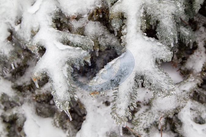 Ice covers spruce branches after freezing rain, Kyiv, Ukraine, January 9, 2026., Credit:Kirill Chubotin / Avalon