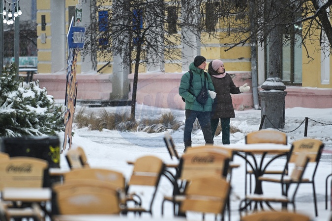 A man and a woman link arms as they walk along Petra Sahaidachnoho Street in the Podilskyi district in winter, Kyiv, Ukraine, January 9, 2026., Credit:EVGEN_KOTENKO / Avalon