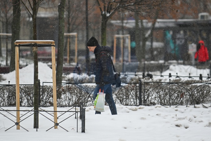 A man walks along a street in the Podilskyi district as it is snowing in winter, Kyiv, Ukraine, January 9, 2026., Credit:EVGEN_KOTENKO / Avalon