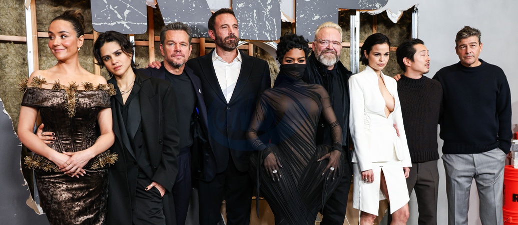 MANHATTAN, NEW YORK CITY, NEW YORK, USA - JANUARY 13: Catalina Sandino Moreno, Sasha Calle, Matt Damon wearing a Luca Faloni suit, Ben Affleck, Teyana Taylor wearing an Ashi Studio look with jewelry by Spinelli Kilcollin and Repossi, Joe Carnahan, Lina Esco, Steven Yeun and Kyle Chandler arrive at the New York Premiere Of Netflix's 'The Rip' held at Alice Tully Hall at the Lincoln Center for the Performing Arts on January 13, 2026 in Manhattan, New York City, New York, United States., Credit:Image Press Agency / Avalon