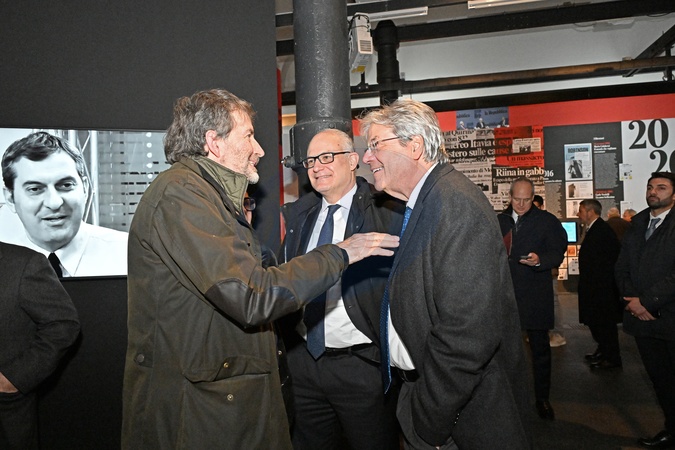 January 14, 2026, Rome. Former Mattatoio. Repubblica 50, Exhibition for the 50th Anniversary of La Repubblica. Pictured: Dario Franceschini, Roberto Gualtieri, and Paolo Gentiloni, Credit:Maria Laura Antonelli / Avalon