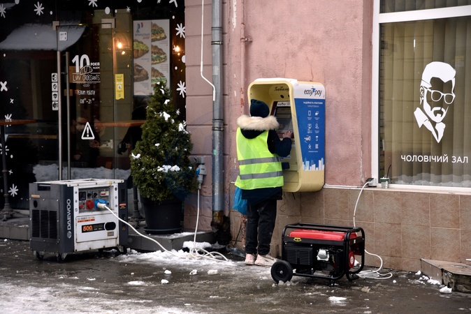 A woman uses a payment terminal flanked by two generators in one of the central streets, Uzhhorod, Zakarpattia region, Ukraine, January 8, 2026., Credit:IGOR TKACHENKO / Avalon